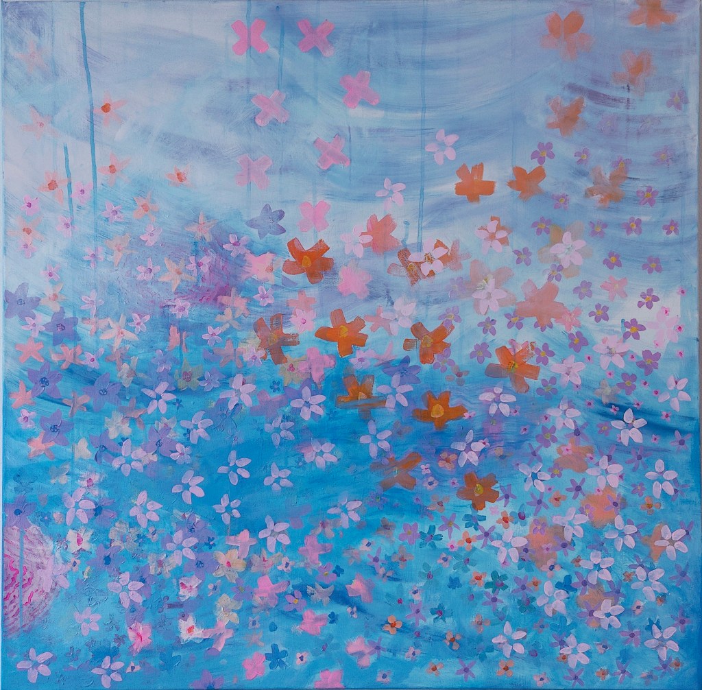 In Kesäyö, drifting blossoms scatter across a luminous blue ground, evoking the lightness of a summer night when darkness never fully arrives. The layered flowers suggest both fleeting motion and quiet stillness — a suspension between day and night, memory and presence. The work captures the atmosphere of Nordic summer nights, where time feels softened and the world is momentarily weightless.
